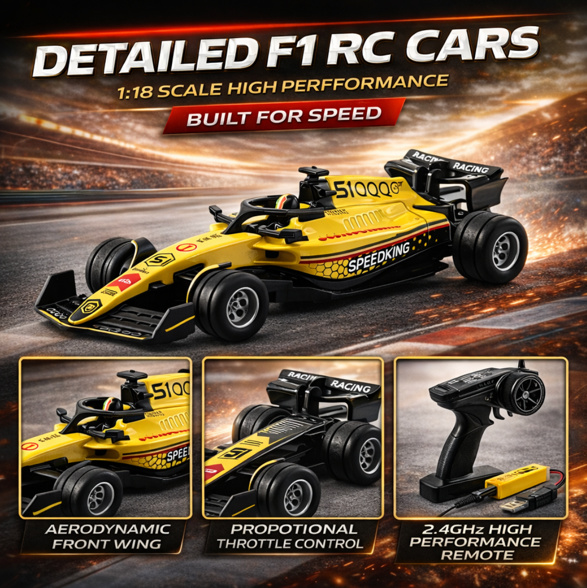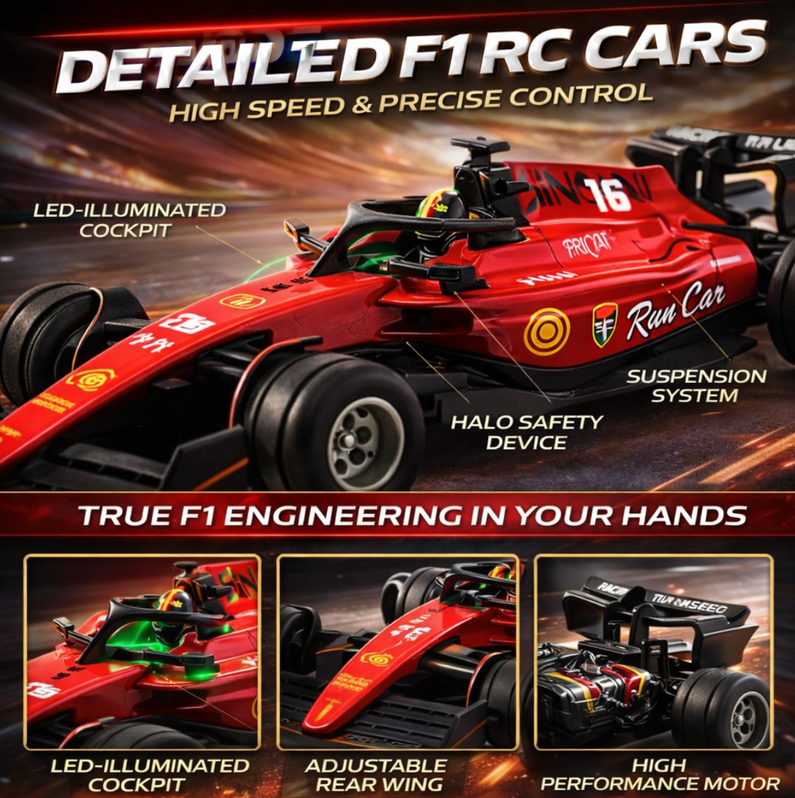 Our F1 RC cars are designed with race-inspired aerodynamics and precision proportions to deliver smooth acceleration, high top-end performance, and realistic handling. Every curve, wing, and surface is shaped to mimic real Formula 1 engineering, giving you an authentic racing feel whether you’re driving indoors or outdoors.
